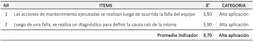Con respecto al indicador mantenimiento correctivo, según los resultados mostrados en la Tabla 2, se aprecia una media de 3,70 ubicándolo en la categoría de alta aplicación, dada la percepción de los encuestados al considerar una alta aplicación con respecto a que las acciones de mantenimiento ejecutadas se realizan luego de ocurrida la falla del equipo (3,50) y que luego de una falla, se realiza un diagnóstico para definir la causa raíz de la misma (3,90)