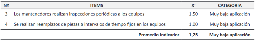 Con respecto al indicador mantenimiento preventivo, se evidencia en la Tabla 3 un promedio de 1,25 ubicándolo en la categoría de muy baja aplicación. Este resultado refleja, desde la perspectiva de los encuestados, muy baja aplicación de las inspecciones periódicas a los equipos por parte de los mantenedores (1,50) y muy baja aplicación de acciones que permitan reemplazos de piezas a intervalos de tiempo fijos en los equipos (1,00)
