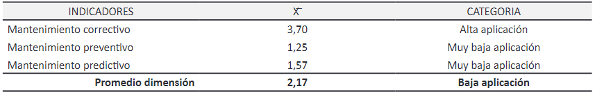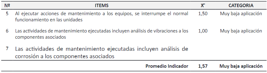 En consonancia con lo anterior, los resultados no alcanzan a validar la teoría de Mobley (2004), para quien las tareas de mantenimiento preventivo tienen por objeto impedir el desarrollo de un tiempo de inactividad no programado o daños prematuros a un equipo, lo que daría lugar a actividades correctivas o de reparación. Para el indicador mantenimiento predictivo, se evidencia en la Tabla 4 un promedio de 1,57 ubicándolo en la categoría muy baja aplicación. Este resultado es producto de una baja aplicación al considerar los encuestados que: al ejecutar acciones de mantenimiento a los equipos, se interrumpe el normal funcionamiento en las unidades (2,70) y muy baja aplicación con relación a que las actividades de mantenimiento ejecutadas incluyen análisis de vibraciones a los componentes asociados (1,00) y las actividades de mantenimiento ejecutadas incluyen análisis de corrosión a los componentes asociados (1,00)
