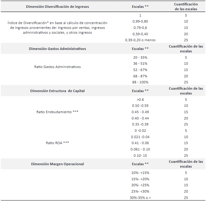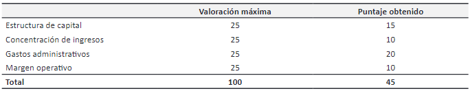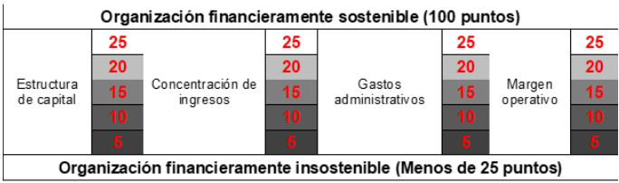 Una vez evaluada cada dimensión, se asigna un valor entre 0 y 25, en función de la tabla de ponderación descrita, para el caso de la dimensión estructura de capital, se aplica un promedio. Los resultados de cada dimensión se suman, y se interpretan en relación con el valor ideal de cien puntos como se muestra en la Tabla 2, siendo los valores menores o iguales veinte y cinco, asignados a una organización financieramente insostenible, y los valores superiores señalarían una mejor situación con respecto a la sostenibilidad financiera.