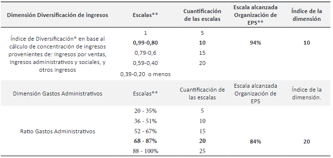 Nota: *El índice determina valores entre 0 y 1, valores cercanos o iguales a uno indican concentración, la situación contraria la señalan valores cercanos a cero. ** Se refiere al cálculo de los indicadores financieros e índice de diversificación sobre los Estados Financieros de la organización de EPS, que constan en el portal de la Superintendencia de Compañías Valores y Seguros del Ecuador (2010). ***Se utiliza dos indicadores de medición promedio de la dimensión estructura de capital.