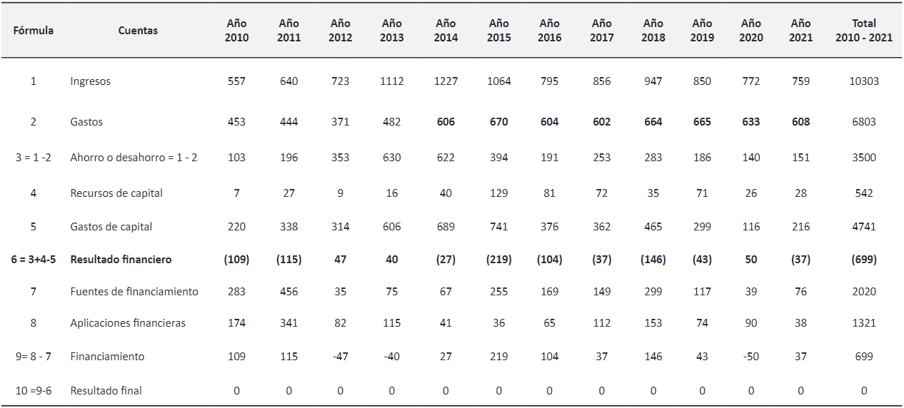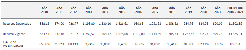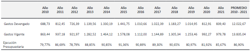 En el periodo 2010 – 2021 se advierte ineficiencia en la ejecución presupuestaria del gasto y recursos siendo inferior al 90%. Asimismo, se observa que se prioriza el gasto corriente que acumuló Bs. 6.823.087.989,07 (sin depreciación) frente a un gasto de capital o inversión sin incluir transferencias de Bs. 3.381.023.000,81.