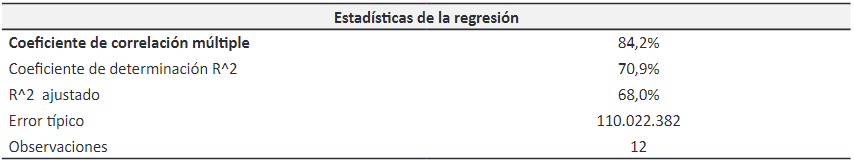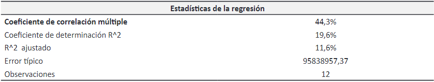 La Tabla 7 muestra que no hay una correlación entre los ingresos y el gasto corriente, el coeficiente de correlación es de 44,3% siendo esta moderada. Es decir, un aumento o disminución de los ingresos no tienen demasiado efecto en el gasto corriente.