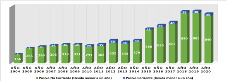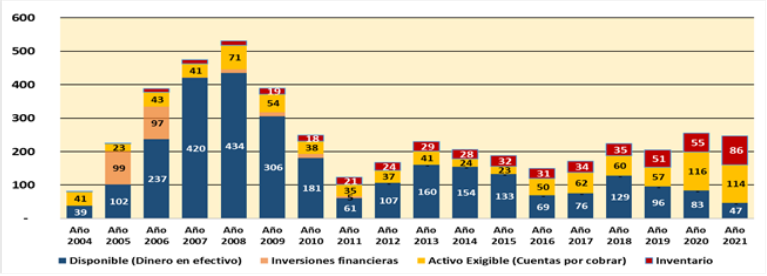 El Gráfico 4 se evidencia que en el periodo 2005 al 2009 se tuvo una elevada inversión en activo corriente, específicamente se tuvo mucho dinero en efectivo, además de inversiones financieras que fueron importantes en 2005 y 2006. Posteriormente el activo no corriente no superó los Bs. 260 millones. Lo que caracteriza este ciclo es una reducción ostensible del dinero en efectivo que se usó para el pago de la deuda pública. Unas cuentas por cobrar que se incrementan y partidas que se mantienen constantes indican que las mismas pueden ser nominales, en otras palabras, muy difícil de cobrarlas. El inventario ha crecido cada año desde el año 2010, lo más llamativo es el incremento de Bs. 30,7 millones registrado entre el año 2020 al año 2021