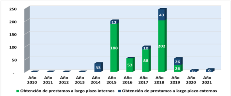 Como se advierte en el Gráfico 7, en el periodo 2010 al 2014 la contratación de deuda casi fue nula, pero a partir de la gestión 2014 hasta el 2021 se contrataron créditos, destacándose dos periodos de elevadas contrataciones que son el año 2015 y 2018 siendo mayormente créditos a largo plazo de fuente interna.