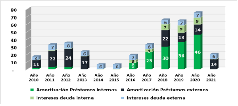 En la gestión 2021 no se paga ni un centavo por concepto de amortización de la deuda pública interna, ni por el pago de intereses de la deuda pública interna. Ese dinero fue usado para acrecentar el inventario y para financiar gastos de capital. El pago de intereses por concepto de deuda externa ha sido constante, por otro lado, el pago de intereses por la deuda pública interna aparece en la gestión 2016 porque un año antes la gobernación se endeudó en más de Bs. 180 millones.