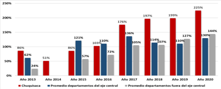 Un incremento anual de las deudas ha sido una constante en el Gobierno Autónomo de Chuquisaca a partir del año 2015, incrementándose deuda en cada periodo, frenándose el endeudamiento en la gestión 2019, porque se llegó al tope de su capacidad de endeudamiento.
