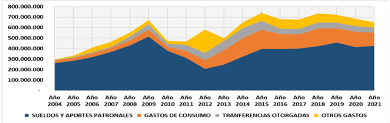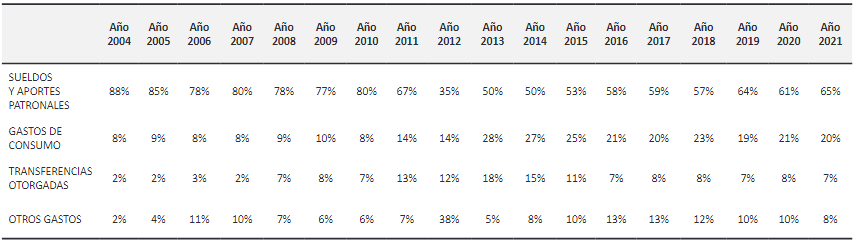 La Tabla 4 muestra que el principal gasto del Gobierno Departamental de Chuquisaca han sido los sueldos y sus accesorios en una primera etapa de la gestión 2004 a 2010; en promedio de cada Bs.100 que se gastaban en la Gobernación, Bs. 75 servían para pagar sueldos y salarios. A partir del 2011 hasta la gestión 2021 los sueldos representan el 56,3%. Los gastos de consumo si bien no son significativos en una primera etapa (2004 – 2011) en promedio 13%, a partir de una segunda etapa los gastos de consumo incrementan su porcentaje llegando a un 32.8%