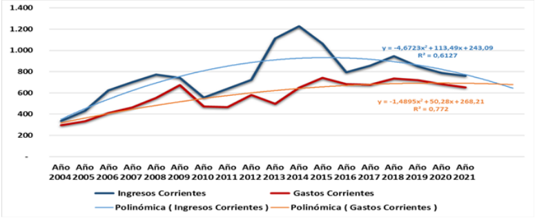 En el Gráfico 3 se muestra que los ingresos financieros (recursos corrientes) han tenido una tendencia parabólica cóncava con cambios muy marcados produciéndose disminuciones importantes en los años 2010, 2015 y 2016, posteriormente se incrementó por dos periodos para luego contraerse las últimas tres gestiones. En el caso de los egresos (gastos corrientes) también se advierte una tendencia parabólica cóncava menos acentuada de crecimiento teniendo picos positivos de mayor gasto en las gestiones 2009, 2012, 2015, 2018 y 2019