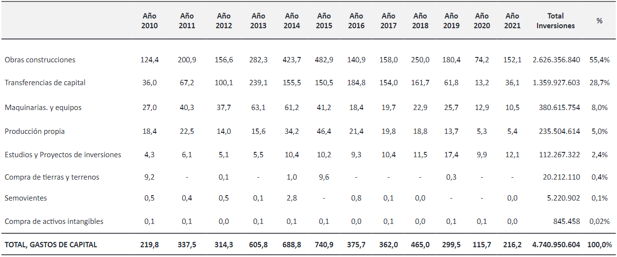 En la Tabla 5 se muestra que el total de gastos de capital ha superado Bs. 4.740 millones en las doce gestiones, la principal inversión ha sido obras en construcciones aproximadamente Bs. 1.359,9 millones. El periodo de mayor gasto de capital se produjo entre los años 2013 – 2015, siendo Bs. 2.035 millones