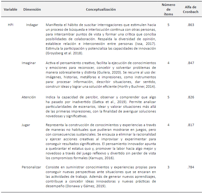 Para la recogida de datos se empleó la técnica de encuesta. Como instrumento, se diseñó un cuestionario con 42 ítems que midieron las variables HPI y FICI mediante una escala ordinal tipo Likert con los valores de frecuencia: 0= nunca, 1= casi nunca, 2= algunas veces, 3= casi siempre, 4= siempre. El instrumento se construyó a partir de las contribuciones teóricas de Horth y Buchner (2014). Cada dimensión de la variable HPI se integró de cuatro ítems; mientras que, las dimensiones de la variable FICI se conformaron con tres ítems cada una.