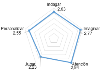 De acuerdo con los resultados, se determinó que Prestar atención (=2.94, =0.8123) es la habilidad con mayor valor; mientras que Jugar (=2.23, =0.9907) es la que registró menor promedio. Sin embargo, todas se sitúan en la frecuencia en que algunas veces ejercen las capacidades para desarrollar nuevas ideas que coadyuven a innovar en sus actividades o situaciones que enfrentan.