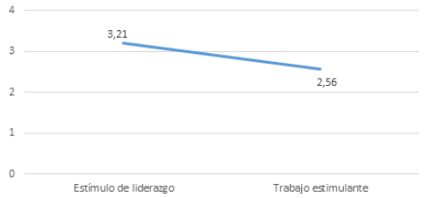 Los resultados permitieron evidenciar que el factor Estímulo de liderazgo (=3.21, =0.8192) presentó la frecuencia de Casi siempre. Mientras que en el factor Trabajo estimulante (=2.56, =1.0418) manifestó una continuidad de Algunas veces.