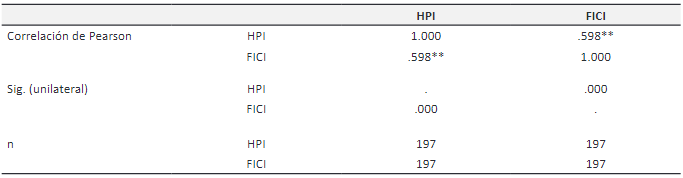 En el análisis de correlación, como se muestra en la Tabla 2, las variables HPI y FICI mostraron correlación significativa. Al respecto, se identificó un valor del coeficiente de correlación de Pearson de r=.598 con un valor de significancia de .000. De esta manera, se evidenció una asociación media entre las variables. Esto permitió aceptar la hipótesis e inferir la relación de incremento recíproco entre los factores impulsores de la cultura de innovación y las habilidades del pensamiento innovador.
