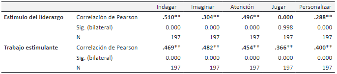 El factor Estimulo del liderazgo mostró correlación positiva media con las habilidades Indagar (r=.510) y Prestar atención (r=.496). Lo que permitió inferir que la colaboración y diversidad de opiniones, e interacción entre las personas para averiguar soluciones novedosas y significativas ante diversos escenarios, podrán robustecerse si el líder promueve un ambiente en el que se estimule la participación y confianza para impulsar el desarrollo de capacidades de innovación, como lo comentan Groysberg et al. (2018).