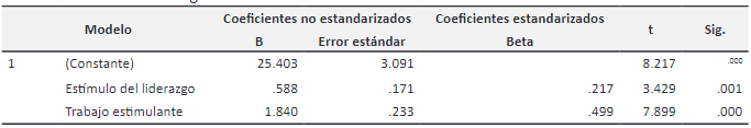 b. Predictores: (Constante), Trabajo estimulante, Estímulo del liderazgo