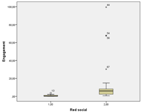 El gráfico de cajas y bigotes (Gráfico 5) muestra la forma en que están agrupados los puntajes de engagement en ambas redes sociales (Facebook = red 1, e Instagram = red 2), se puede apreciar que existe mayor variabilidad de datos en la red social Instagram
