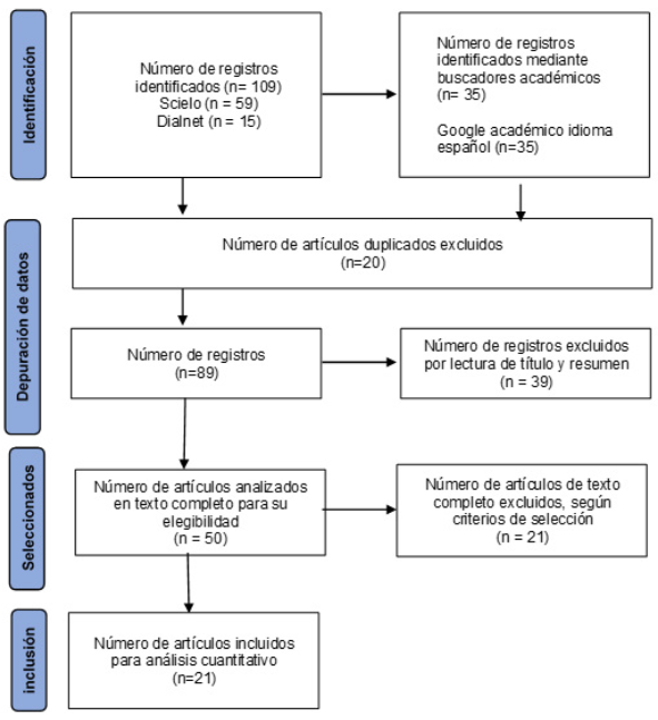 En la búsqueda se empleó bases de datos tales como Scielo y Dialnet; también el buscador especializado denominado Google Académico que permitió el acceso a un total de 109 registro relacionados con el tema, de los cuales se eliminaron 20 registros por estar duplicados, dejando un total de 89 registros relacionados con el tema. Adicionalmente, 39 fueron descartados por no contribuir al contenido de la investigación como es el título y resumen. Se seleccionaron 21 trabajos que aportan al tema de la investigación considerando los dominios de: título, resumen, introducción, materiales, métodos, resultados y discusión. Posterior a esto, se realizó el registro de la información; también, se procedió a realizar la redacción del documento, empleando el método de análisis y síntesis, partiendo de lo general a lo particular y en contexto nacional e internacional (Figura 1)