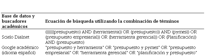 La metodología utilizada en esta investigación fue una revisión sistemática con carácter descriptivo-exploratorio, basado en artículos científicos publicados entre los períodos 2008 – 2022. Se realizó una búsqueda y selección de información de los siguientes países: México, Perú, Colombia, Argentina y Ecuador. Además, se priorizó el análisis de la información reunida en conjunto con la síntesis de palabras y contextos claves tales como: “presupuesto y herramienta”, “planificación y presupuesto”, “presupuesto y Pymes”, “herramienta gerencial”; “presupuesto empresarial”. El análisis de la información tuvo un enfoque multidisciplinar, puesto que, se apoya en los aportes de planificación, administración, investigación operativa y control (Tabla 1)