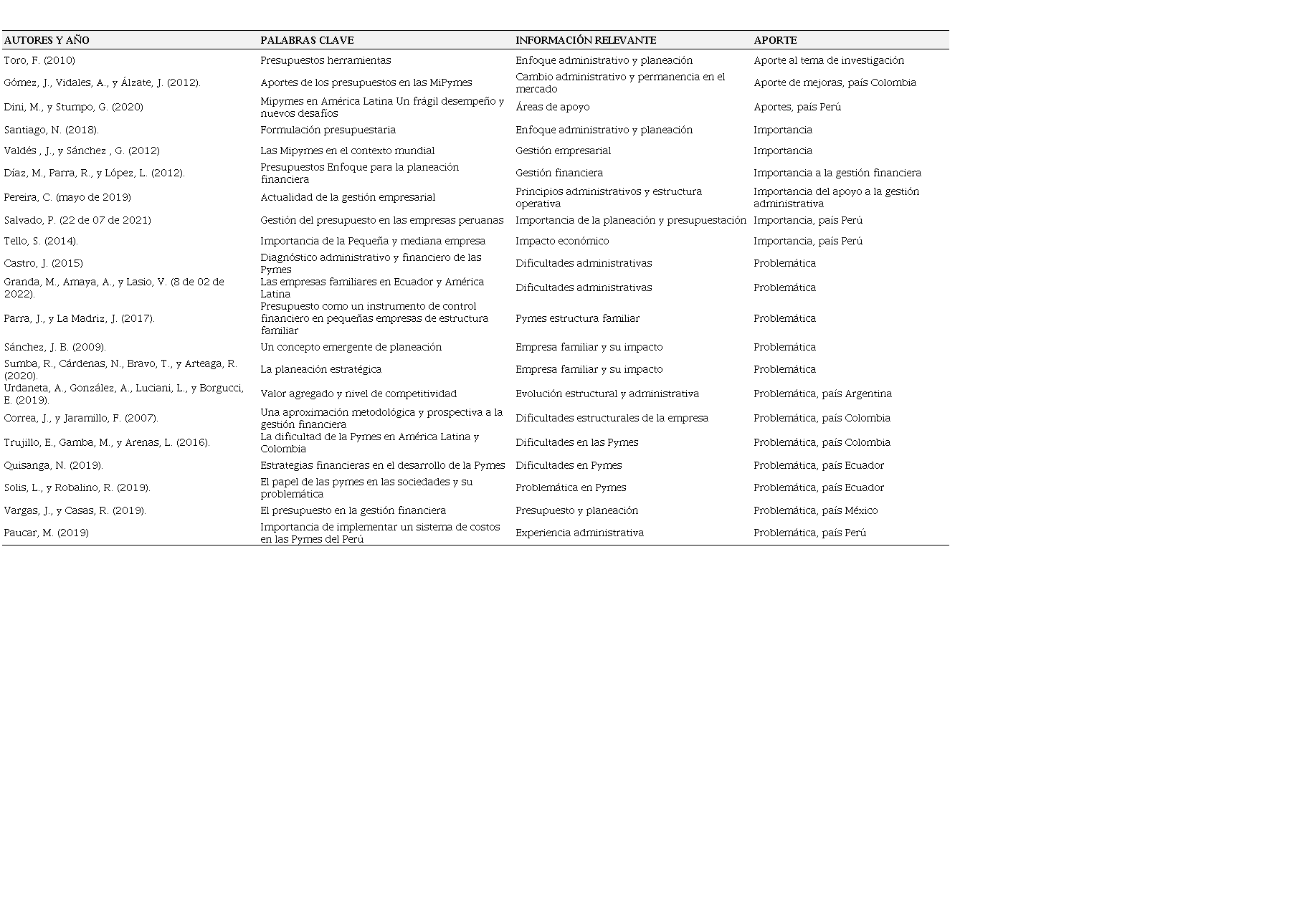 En este contexto, las pequeñas y medianas empresas (Pymes) tienen un gran impacto en lo económico para América del Sur y el Caribe, por su contribución al empleo y una participación reducida en el Producto Interno Bruto-PIB (Tello, 2014; OECD/CAF, 2019); así también, las Pymes cuentan con escasa información sobre el análisis de su desempeño, esto se debe a que existen diferentes definiciones sobre este grupo de empresas en los países de la región. Por ello, el estudio tiene como finalidad determinar aspectos relevantes que apoyen al desarrollo de los presupuestos como una herramienta de planificación y control, basado en las experiencias de estudios previos, así como en los resultados obtenidos de su aplicación en el ámbito empresarial.