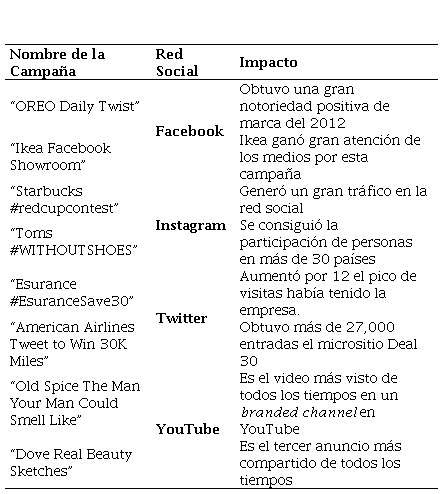 La campaña que consiguió mayor interacción en Facebook fue la campaña “OREO Daily Twist” que obtuvo una gran notoriedad positiva de marca del 2012, y la que ganó gran atención de los medios fue la campaña “Ikea Facebook Showroom”. En Instagram “Starbucks #redcupcontest” genero un gran tráfico en la red social y “Toms #WITHOUTSHOES” consiguió la participación de usuarios en más de 30 países. En Twitter “Esurance #EsuranceSave30” aumentó por 12 el pico de visitas que había tenido la empresa hasta el lanzamiento de la campaña y “American Airlines Tweet to Win 30K Miles” obtuvo más de 27,000 entradas el micrositio Deal 30 creada especialmente paraesta promoción. Por último, en YouTube “Old Spice The Man Your Man Could Smell Like” fue el video más visto de todos los tiempos en un branded channel de esta red social y “Dove Real Beauty Sketches” fue el tercer anuncio más compartido de todos los tiempos hasta ese momento.