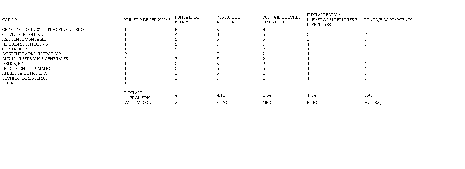 El test toma en cuenta tres aspectos intrínsecos principales de la fatiga laboral, a través de tres dimensiones: 1) Diez preguntas sobre las necesidades mentales en el trabajo; 2) Diez preguntas referentes al rendimiento físico fatigado; y por último, 3) Diez ítems de síntomas mixtos. La población de estudio fue una empresa con más de 30 años de experiencia en servicios petroleros ubicada en territorio ecuatoriano. Esta empresa se acogió al teletrabajo a partir del año 2020 fecha en que inició la pandemia de la COVID-19. Se aplicó el “Test Yoshitake” a 13 colaboradores del personal administrativo que trabaja en las oficinas de Quito. Se excluyó al personal operativo que se encontraba en el Oriente debido a que ellos no se acogieron a la modalidad de teletrabajo. Cabe mencionar que, el personal administrativo de la empresa que brinda servicios petroleros está conformado por un gerente administrativo financiero, un contador general, un asistente contable, un jefe administrativo, un controler, dos asistentes administrativos, dos auxiliares de servicios generales, un mensajero, un jefe de talento humano, un analista de nómina, y un técnico de sistemas.
