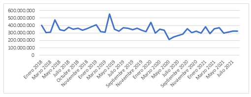 En la Figura 1, se exprese que la recaudación tributaria obtenida del sector comercial de la Zona 6 comprendida por las provincias de Azuay, Cañar y Morona Santiago durante el periodo previo a la pandemia presentó cambios en los meses de declaración y pago de impuesto a la Renta con valores superiores a los que se evidenció en el año 2020, por efecto de la pandemia sufrió bajas en los montos de recaudación siendo su pico más bajo en el mes de mayo de 2020 por las facilidades y el diferimiento de pago de impuestos, así como una consecuencia de la contracción económica, ya que se mantuvo el confinamiento, lo que repercutió en un baja de ventas de los sectores no esenciales, a partir de julio 2020 se suavizaron las medidas de aislamiento y empieza a recuperarse lentamente el sector, sin embargo no se alcanzan los niveles de recaudación que se tenían pre pandemia.