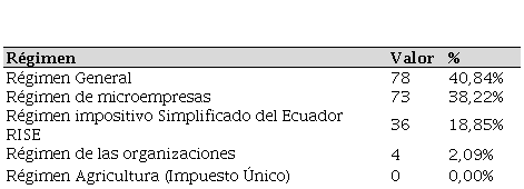 Las MIPYMES del sector comercial se registran en la Tabla 1, principalmente en el régimen general con un 40,84% y en el régimen de microempresas en 38,22%, en tanto que el régimen simplificado se encuentra en tercer lugar con el 18.85% y el Régimen de Organizaciones de Economía Popular Y Solidaria (EPS) cuenta con el porcentaje menor dado su reciente creación y limitado desarrollo. La diferencia entre los regímenes radica en la simplificación de las declaraciones y en la forma de cálculo y pago de su impuesto en la renta lo que permite que los contribuyentes puedan reducir sus obligaciones tributarias con regímenes como el RISE y el Régimen para Microempresas, con la desventaja que su carga impositiva está basada en ventas y no en utilidades