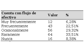 Las MIPYMES con relación al flujo de efectivo en la Tabla 3 mencionan que un 62,83% de las fechas establecidas por el SRI permiten contar con flujo de efectivo para cumplir sus obligaciones tributarias entre raramente y ocasionalmente, lo que indica que las fechas de pago impuestas por el SRI no necesariamente coinciden con los flujos de efectivo de los contribuyentes, y en un 28.80% las empresas tienen fondos suficientes entre frecuente y muy frecuente para afrontar estos compromisos.
