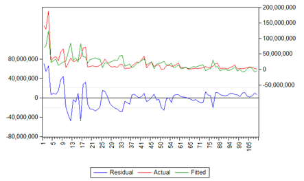 La salida del modelo, muestra que R2 (0.5524), representa un 55% de una variabilidad de los datos reales, se puede decir que es un valor aceptable para validar los datos. La prueba f muestra validez global de los datos, en donde p- value es igual a 0000, lo cual quiere decir que el ajuste del modelo es bueno. En la Figura 1, se analizan los residuos. Las líneas del gráfico de color rojo son los valores observados de la variable dependiente Y (consumo), mientras que las líneas de color verde son los valores ajustados y pronosticados en el modelo; se puede observar que existen tres valores atípicos, en los que se puede evidenciar que el modelo no se puede pronosticar, en tanto que, en los demás valores el modelo se puede ver que si existe una muy buena bondad de ajuste