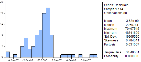 A fin de anular o afirmar la hipótesis, como se observa en la Figura 2 se realizó el análisis de histograma de normalidad de residuos, tanto la media como la mediana son cercana a cero, también se puede observar el coeficiente de simetría (0.784311), por lo tanto, se puede ver que existe una asimetría hacia la derecha. Un coeficiente de curtosis o de apuntamiento, con un valor de 5.631007, lo que representa una curtosis no normal, es una distribución leptocúrtica porque es mayor a 3
