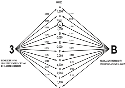 Una vez realizado el proceso se determinó que la Acción No. 3 incide en el efecto establecido en el Literal B a través de su variable escondida C. Se aprecia de mejor manera en la Figura 3 donde se determinó las variables con su escenario que se convierte en la estrategia de mejora a ser aplicado por el sector objeto del presente estudio:
