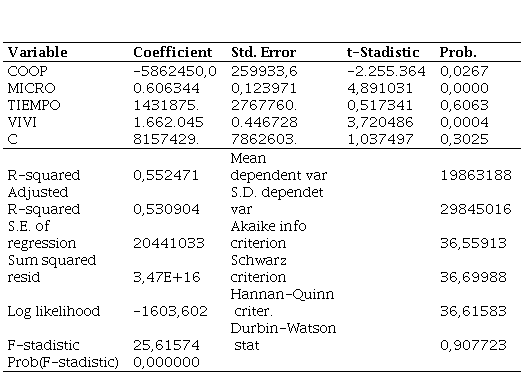 En la Tabla 1 se puede observar, los coeficientes estimados de cada una de las variables, las desviaciones estándar, la prueba t (estadístico de la prueba t) y el p- value. La estimación determina que existe una relación negativa entre las cooperativas; una relación positiva entre la variable dependiente y las variables independientes de tiempo y vivienda. En cuanto a las desviaciones estándar el tamaño de los errores con relación a los coeficientes, se visualiza que son muy grandes, siendo así, el microcrédito y el tiempo, es mayor al valor estimado. La prueba de significación, si se toma un valor alfa de un 10%, se puede ver que son estadísticamente significativos, las dos variables cooperativas y microcréditos, tienen un impacto en la estructura del modelo de las variables de consumo.