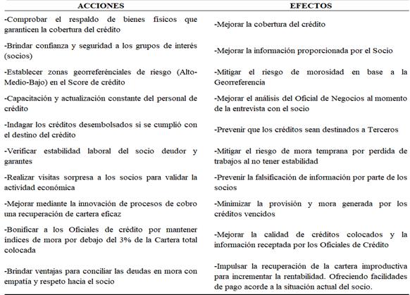 En el desarrollo de este estudio a los Directivos de las Cooperativas de Ahorro y Crédito del Segmento 1 en Ecuador la estrategia para la mejora de los índices de morosidad para obtener mayor liquidez y rentabilidad que se obtendrá colocando créditos de calidad, dicha estrategia servirá para que los Oficiales de Negocio indaguen mejor la información proporcionada por el socio, no existe un socio con riesgo 0 sin embargo, mediante la estrategia de estudio proporcionada se buscó minimizar dicho riesgo, aplicando la estrategia de enfocarse en establecer zonas georeferenciales de riesgo en el Score de crediticio con la finalidad de un mejor toma de decisión para el ingreso del crédito