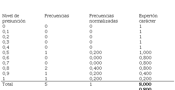 Con la información obtenida se estructura la frecuencia, se determina las repeticiones del grado de presunción en relación al número de expertos consultados, luego se normaliza la frecuencia, esta es la distribución entre los datos obtenidos en la frecuencia y el número de expertos consultados. Luego, se establece la acumulación de frecuencias, para ello se inicia con el último valor en forma ascendente hasta llegar a obtener la unidad, a partir de ahí todos los valores se consideran uno, luego la suma de ese proceso se realiza solo a partir de 0,1 lo cual se detalla en la Tabla 4.