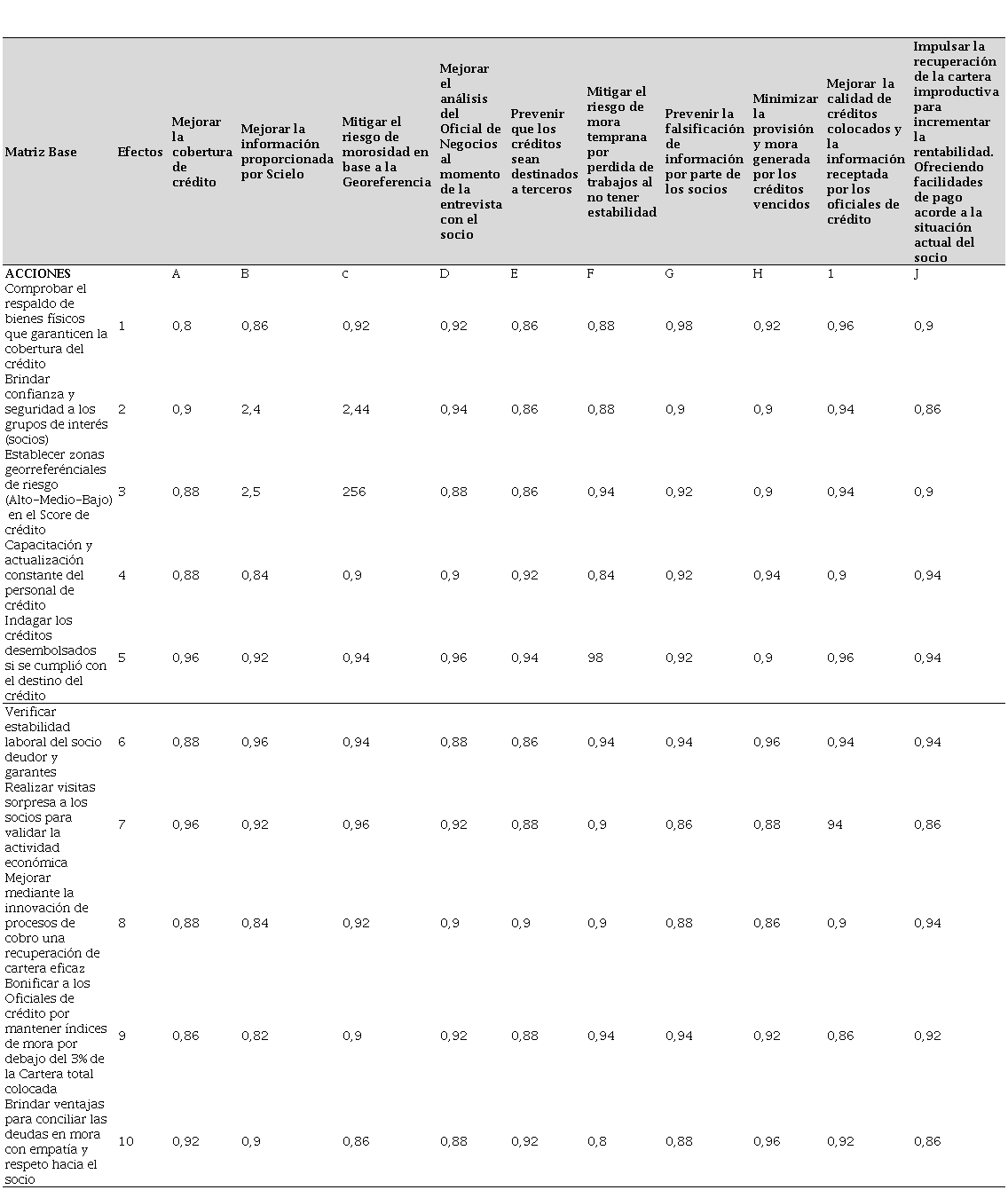 Una vez realizada la consulta a los cinco expertos de las principales Cooperativas de Ahorro y Crédito del Segmento 1 que aportaron con su criterio relacionando a la incidencia entre las acciones y efectos los cuales se relacionan directamente a la busca de la mejor estrategia para la mejora en los índices de morosidad de la cartera de créditos vencida y que se encuentran detallados en la Tabla 4 se presenta el resultado de los expertos en la aplicación de la matriz cuadrada, para luego trasladar los datos completos o matriz base.