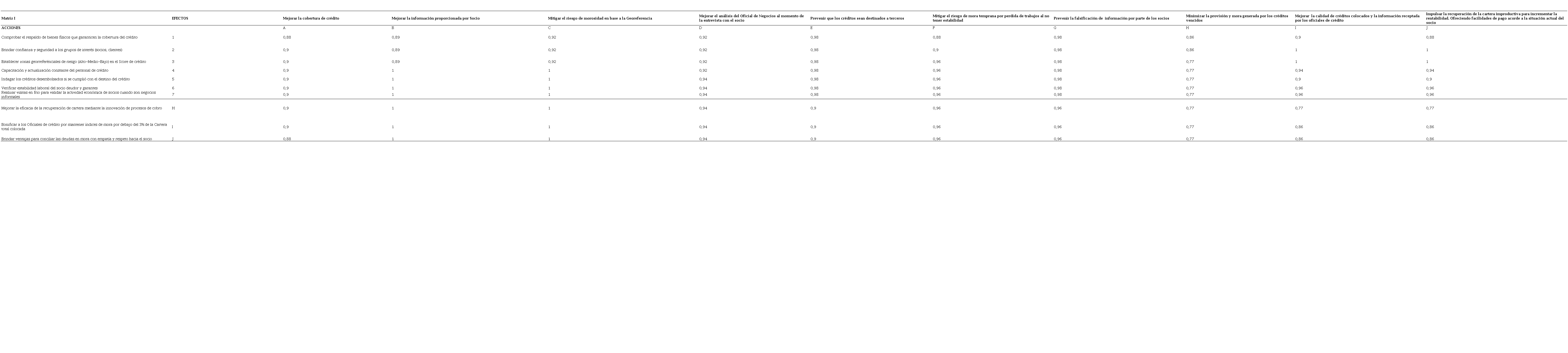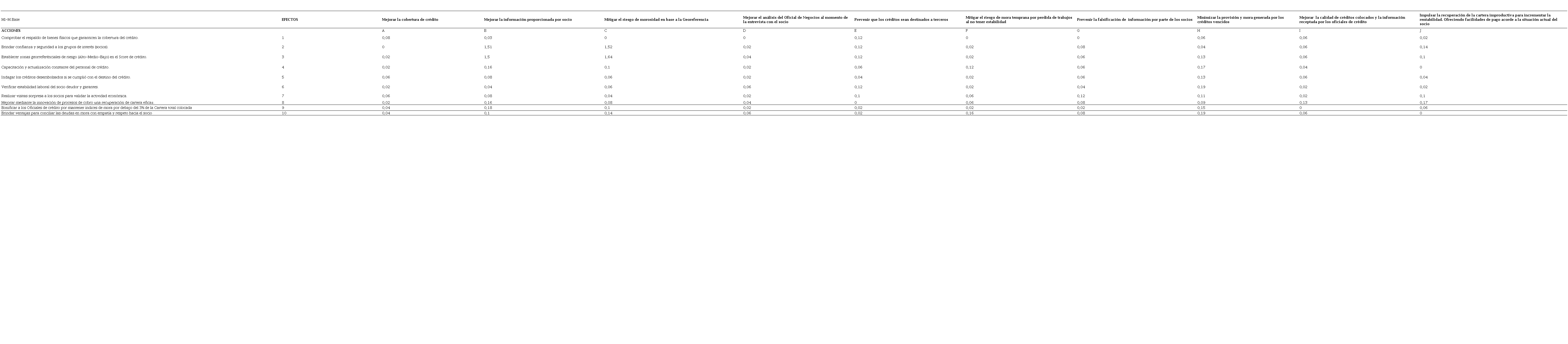En la Tabla 3 se observa, la matriz de acciones y efectos de forma cuadrada, que contiene el mismo número de variables, la acciones y efectos descritas tributan a las normas del Sistema de Monitores PERLAS, luego se procedió a la aplicación de esta herramienta que ofrece la lógica borrosa como el expertizaje y la teoría de efectos olvidados, con la cual se determina el efecto olvidado u omitido, para intentar dar solución al problema de los altos índices de morosidad en la cartera de créditos vencida.