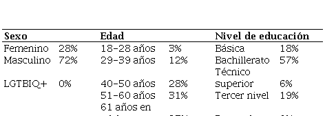 En la Tabla 1 se destacan los datos demográficos que manifiestan que el 28% de la población es femenina, 72% masculina; la tendencia de las organizaciones hacia el género masculino es común; sin embargo, se analiza un grupo importante de involucramiento de mujeres dentro de las organizaciones sobre todo en el sector productivo.