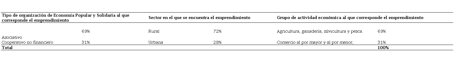 Seguidamente en la Tabla 2 es destacado los tipos organizaciones que existen de emprendimientos arrojando que un 69% pertenecen a un tipo asociativo a las cuales la ley las reconoce en el artículo 24 de la LOEPS. El 31% de organizaciones pertenecen al sector cooperativo no financiero como son de servicios y de producción; en las cooperativas de servicios se localizan las de transporte liviano que inmiscuye a camionetas simples, doble cabina, transporte pesado como buses y carga; y dentro de las de producción están las agrícolas, comunales, pecuarias, lecheras. Al respecto la ley manifiesta que son mencionadas en el artículo 34 de la LOEPS.