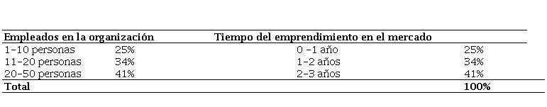 En la Tabla 3 es destacado el número de socio y el tiempo que tiene el emprendimiento en el mercado mostrando que las organizaciones mantienen una composición del 40% entre 20 y 50 personas principalmente pertenecen a cooperativas de producción agrícola, 34 % entre 11 a 20 personas, 25% de 1 a 10 personas; 51% pertenecen por más de 10 años, 22 % entre 6 a 10 años, 18 % entre 4 a 5 años y 9 % de entre 2 a 3 años. Se establece una composición de las organizaciones entre 20 a 50 personas, constituidas por más de 10 años y principalmente de las zonas rurales.