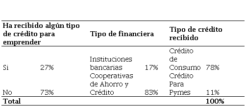 En la Tabla 4 son destacados los tipos de créditos y el medio para la obtención, por lo tanto, se pudo comprobar que el 73% de las organizaciones no ha recibido ningún tipo de crédito, el 27 % indica que, si lo recibió, un 83 % lo hizo de Cooperativas de ahorro y crédito el 17 % de bancos, 78 % bajo líneas de consumo, 11 % para créditos de Pymes y el 11 % hipotecarios. Sin embargo, el rol de los emprendimientos en acceso a financiamiento no es significativo, a pesar de que existe una diversidad de instituciones y productos financieros los cuales pueden satisfacer las necesidades de recursos de los emprendimientos de la EPS.