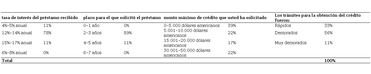 Posteriormente en la Tabla 5 de los créditos adquiridos 78% fueron a una tasa del 12% - 14%; 11% entre el 4 %-5 % al igual del 15 % -17 %; el 89 % de créditos realizados fueron en tiempos entre 2 a 3 años y el 11% entre los 4 a 5 años; el monto pedido muestra que un 39 % en estuvo entre los $5000; 22 % hasta los $10000; 17% hasta los 20000 y el 22% hasta los 50000; por su parte la gestión en el tiempo en esta muestra que un 56 % expresa que son demorados, el 11 % muy demorados y un 36% rápidos. Se establece que el acceso al crédito de parte de las organizaciones es bajo la tasa promedio esta entre el 12%-14%; en plazos no mayores a los 5 años, en montos menores a los $10000 cuya gestión es demorada