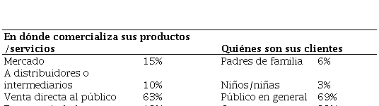 En la Tabla 6 es destacado con relación al lugar en dónde comercializan los productos se establece que el 63% lo hace de venta directa, el 15% en el mercado, el 12 % en otras ciudades y el 10 % a distribuidores o intermediarios. La comercialización es ampliamente local y representa un rubro importante para la economía de la ciudad. Los clientes en 69 % en gran mayoría son el público en general, 22 % otros, 6% padres de familia y 3 % niñas y niñas. El público en general constituye los clientes objetivo de los emprendimientos, de tal forma los emprendimientos buscan satisfacer las necesidades de las personas y la sociedad en general, entonces es importante conocer las características locales del mercado y clientes, asumiendo que es una debilidad el no mantener un estudio de mercado y estrategias de marketing.