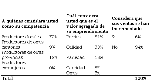 Tabla 7 La competencia de los emprendimientos de la EPS de Cañar son un 72 % de productores locales, y un 9 % de otros cantones. Los precios marcan el 51 % de preferencia en la compra, el 30% la calidad, el 13 % la variedad, 3 % la cantidad y otros. Para el 94 % de los emprendimientos, las ventas no se han incrementado mientras que para un 6 % si lo han hecho. Se establece un alto nivel de competitividad interno en cuanto a precios, calidad y variedad, pero apenas un 6 % se sobresale a estas fuerzas de competitividad, lo que representa una debilidad de la empresa por no adoptar estrategias que guíen al crecimiento de los emprendimientos