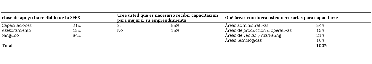 En la Tabla 8 el 64 % de emprendedores indican no haber tenido ningún apoyo de la SEPS, en tanto que el 21 % expresa haberlo recibido por medio de capacitaciones, y el 15 % por medio de asesoramiento; El 100% de los emprendedores manifiestan que la capacitación es un punto fundamental para mejorar los emprendimientos. El 54 % responde que es necesario recibir capacitación en áreas administrativas, el 21 % en áreas de ventas y marketing, el 15 % en producción y el 10 % en áreas tecnológicas. La capacitación es una debilidad que presentan los emprendedores