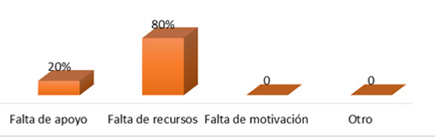 Finalmente, según el criterio de los docentes, en la Figura 11 el factor que mayor influencia tiene en la puesta en marcha de los proyectos de emprendimiento estudiantiles, es la falta de recursos económicos (80%) y la falta de apoyo institucional o familiar (20%).