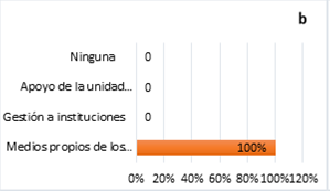 En la Figura 10a se muestra que según la mayoría de docentes (60%), cada año lectivo se llegan a poner en marcha un promedio de 2 proyectos, mientras que, el 40% señala que se implementan un promedio de 4 proyectos. Con respecto a la fuente de donde se obtienen los recursos necesarios para poner en marcha sus propuestas, todos los docentes concuerdan que provienen de medios propios de los estudiantes tal como se puede apreciar en la figura 10b