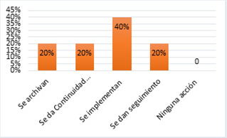 De la mano de los resultados anteriores, la totalidad de los docentes consideran que las propuestas de emprendimiento se podrían llevar a cabo. En cuanto a la continuidad de los proyectos en la Figura 9, se plantea que luego que los estudiantes se gradúan de bachillerato, el 40% pone en marcha su idea de negocio, al 20% de los que se implementan se les da seguimiento, y otro 20% es archivado.