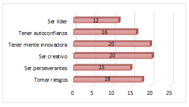 En cuanto a las características personales que demuestran tener los estudiantes como futuros emprendedores, se destaca que las actitudes más sobresalientes son: creatividad y mente innovadora (20% cada una) y disposición para tomar riesgos (18%), la mayoría prefiere ser empresario (91%), son personas optimistas y con visión para los negocios la mayor parte de las veces (51%). Esto concuerda con otros estudios donde los emprendedores se destacan por sus habilidades para detectar una oportunidad de negocio (33%) (Cordero et al., 2011) y visión empresarial (55.95%) (Borja et al., 2020).