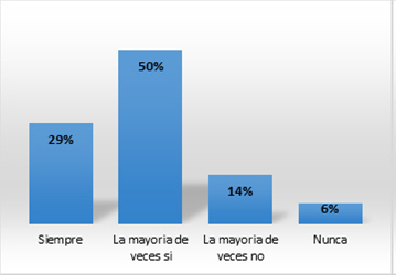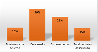 Con respecto al apoyo institucional, en la Figura 5 los resultados muestran que los estudiantes sí cuentan con este apoyo para poder implementar sus proyectos (40% de acuerdo y 16% totalmente de acuerdo), mientras que un porcentaje menor no tiene esta ventaja (29% en desacuerdo y 15% en total desacuerdo)